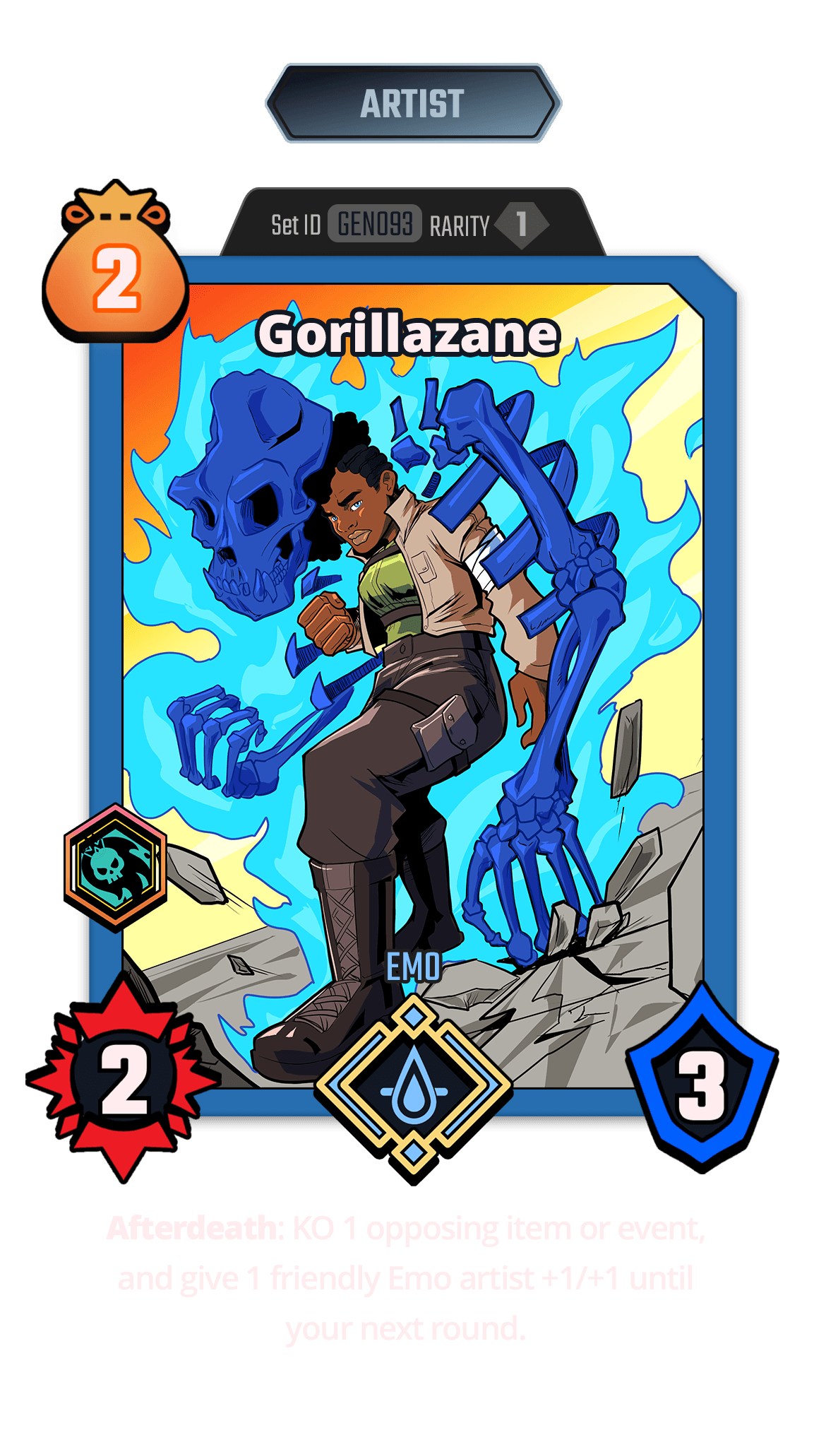 Afterdeath: KO 1 opposing item or event, and give 1 friendly Emo artist +1/+1 until your next round.