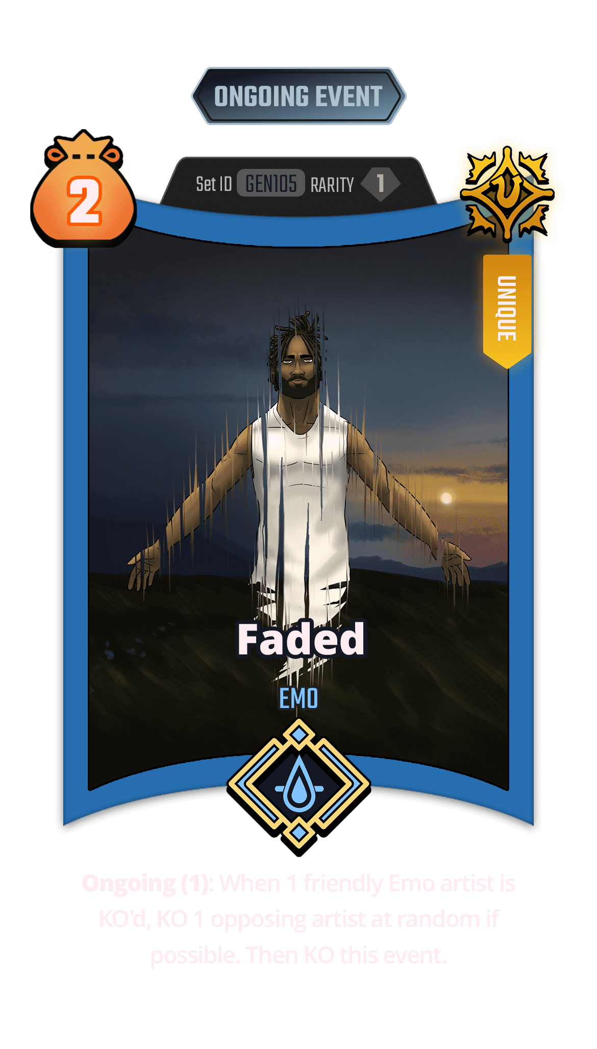 Ongoing (1): When 1 friendly Emo artist is KO'd, KO 1 opposing artist at random if possible. Then KO this event.