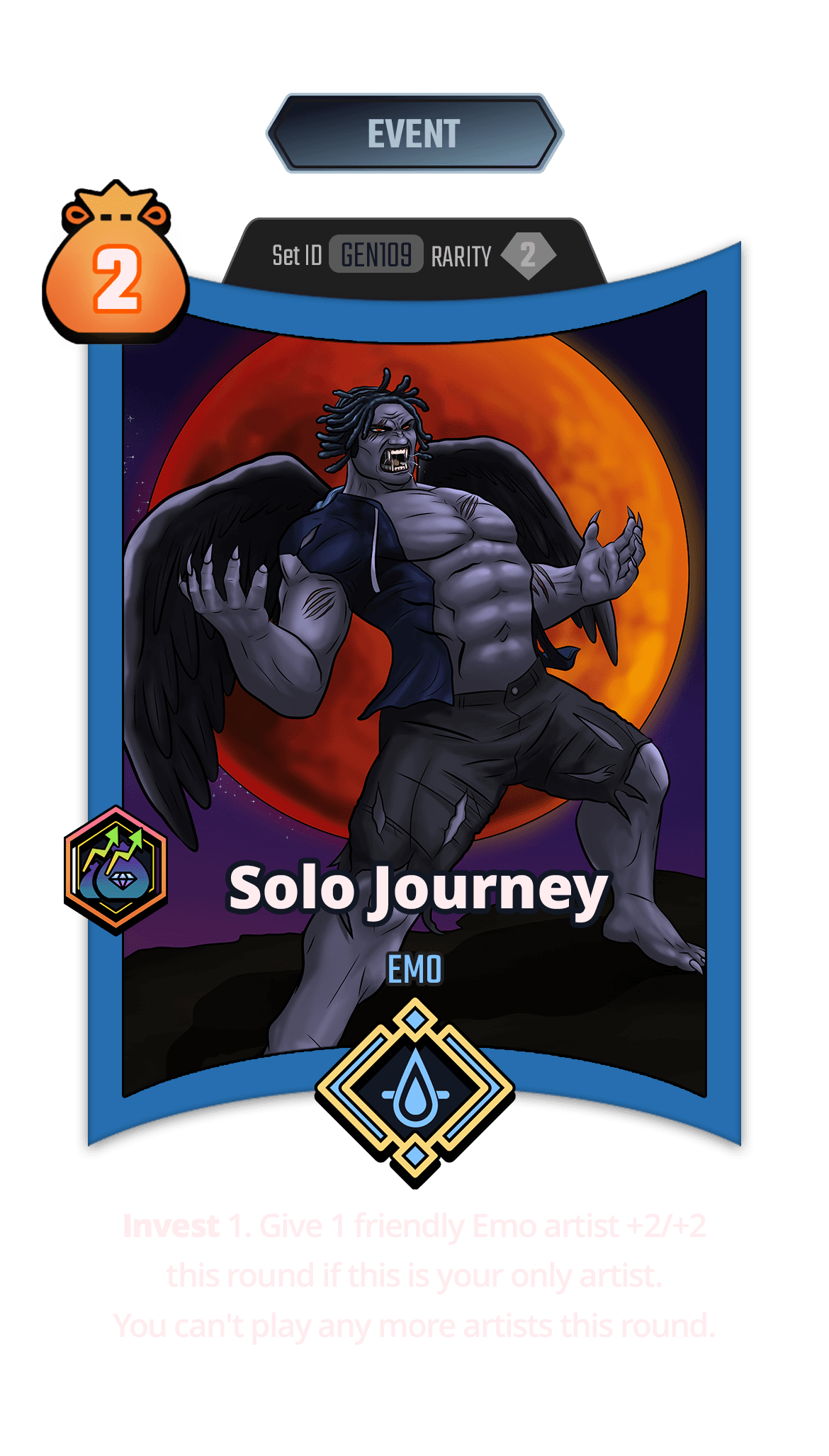 Invest 1. Give 1 friendly Emo artist +2/+2 this round if this is your only artist. You can't play any more artists this round.