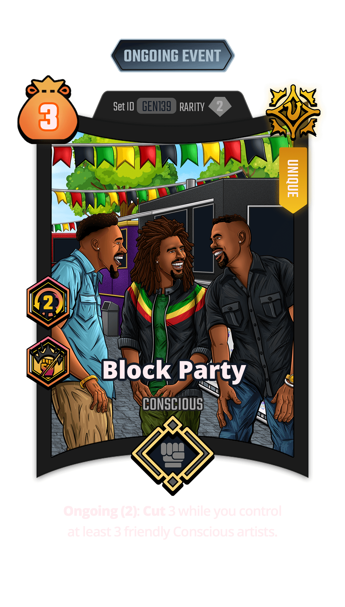 Ongoing (2): Cut 3 while you control at least 3 friendly Conscious artists.
